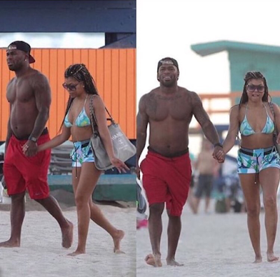 While walking along the sandy beaches, photographers spotted the 45-year-old wearing an Emilio Pucci bikini with matching shorts….and some eye candy who has been identified as NFL athlete